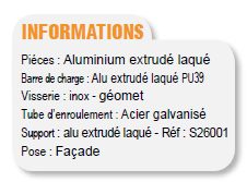 - commande radio avec télécommande à distance ou automatisme au vent et au soleil avec commande radio intégrée, automatisme au vent, soleil et pluie avec commande radio intégrée, sécurité vent par capteur de vibration, en options cliquables